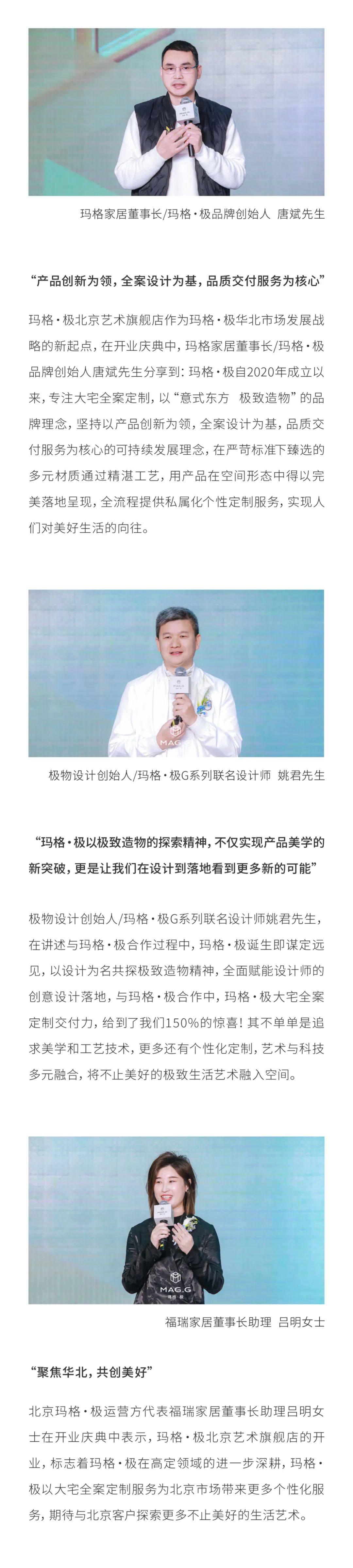 北京瑪格·極副總經(jīng)理孫志星先生,對(duì)北京市場(chǎng)的運(yùn)營(yíng)作了積極展望,期待瑪格·極北京藝術(shù)旗艦店在未來(lái)深耕北京市場(chǎng),與北京的客戶們共同探索更多不止美好的生活藝術(shù)。